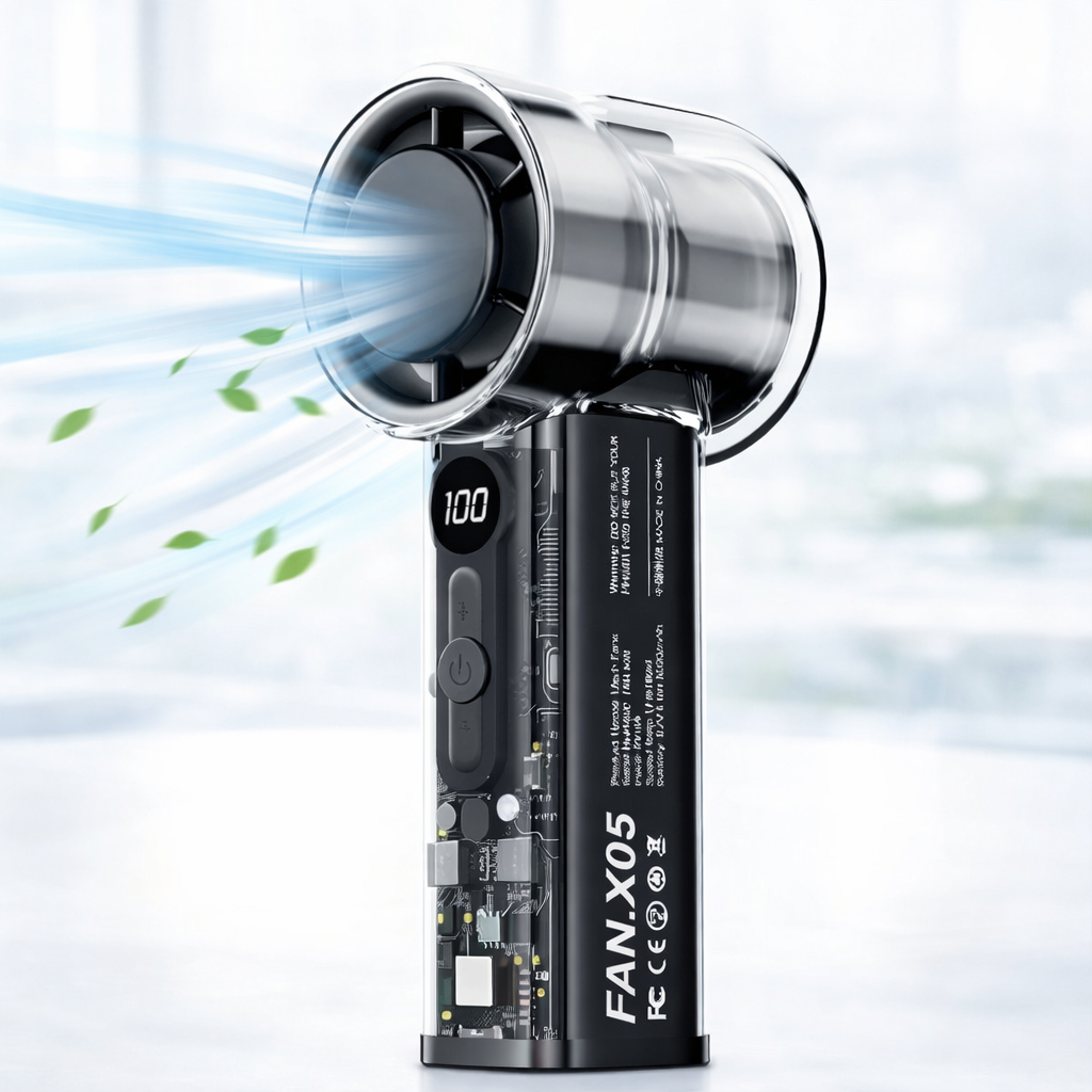 ZYLO Transparent Turbo Fan – Foldable Bladeless Handheld Cooling Fan with Digital Speed Display