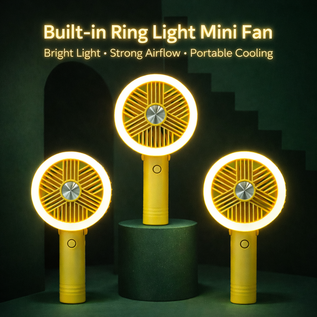 GlowBreeze Rechargeable Mini Fan with Ring Light & 3 Speed Cooling for Office, Selfie & Travel