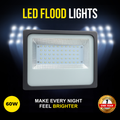 High-intensity 60W LED flood light with pure white output, a rugged aluminium body, and IP65 waterproof construction – perfect for reliable outdoor security and area lighting.
