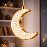 A premium crescent moon-shaped hanging light with sparkling crystal texture and a warm glow. Designed for aesthetic bedrooms, kids rooms and festive décor—featuring a clean single mode lighting effect.