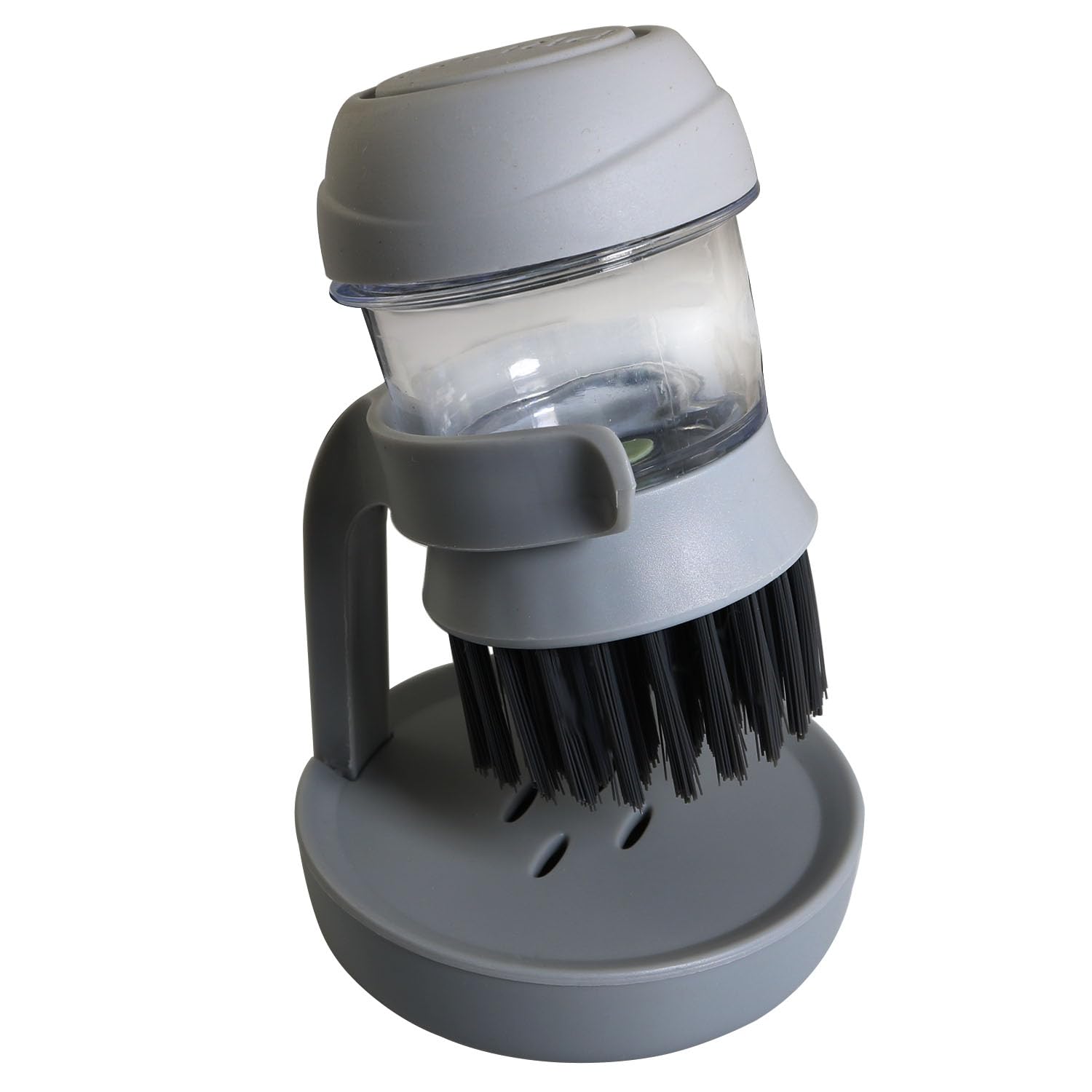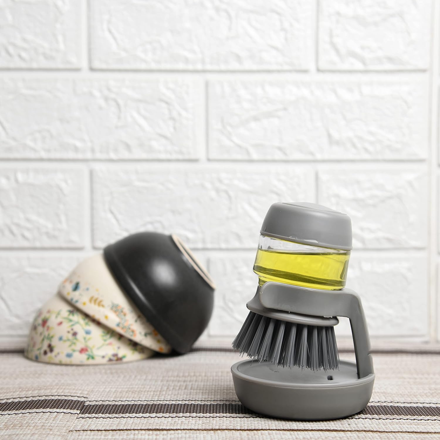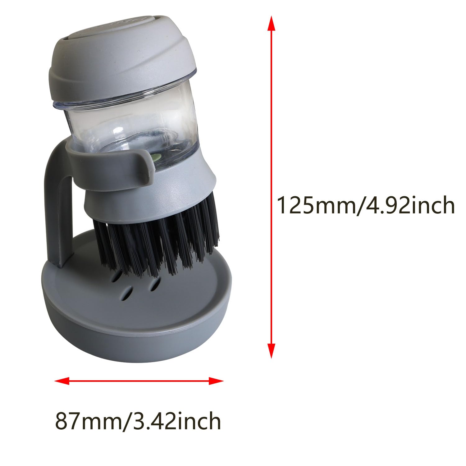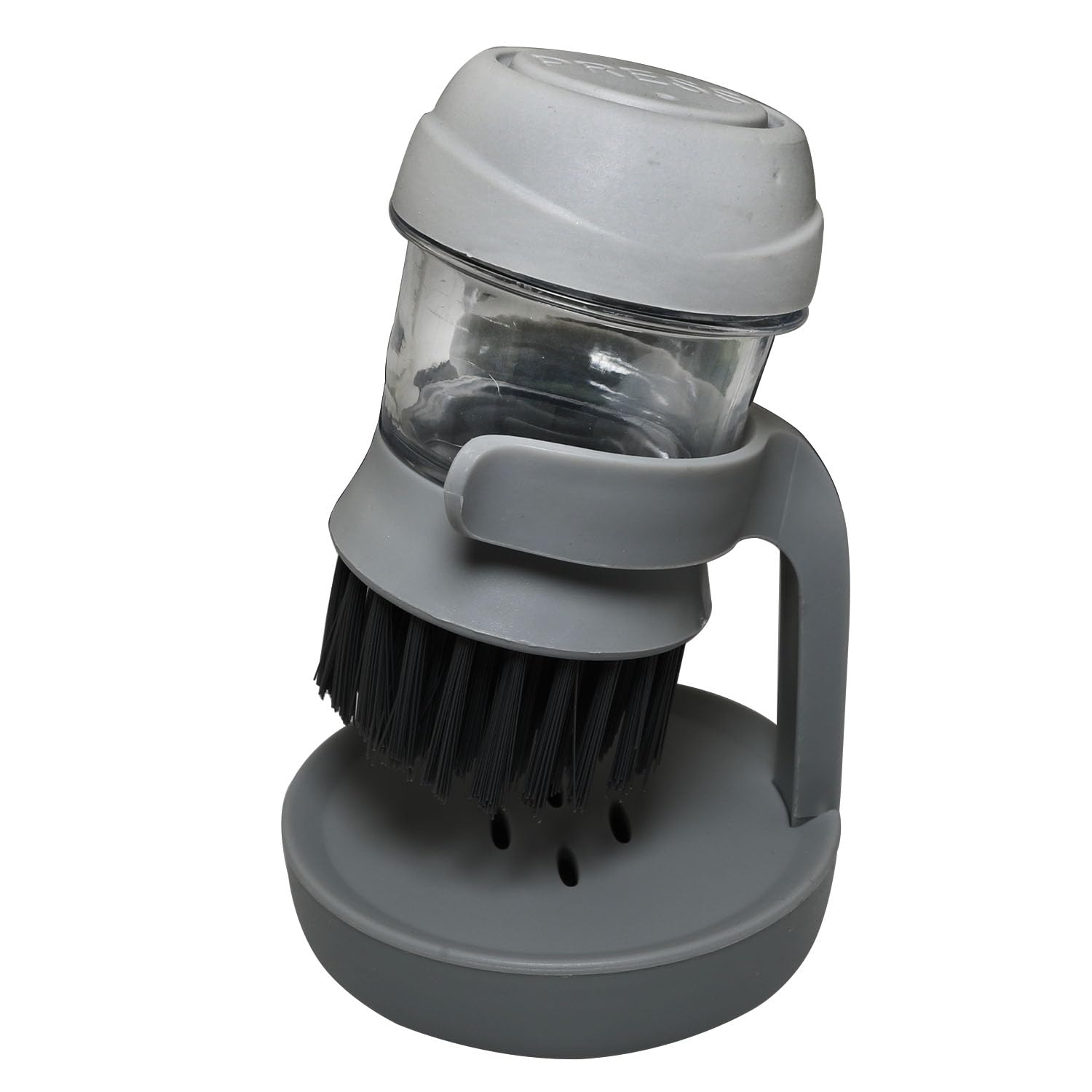 Household Kitchen Stove Utensils Cleaning Brush Grey Soap Storage Dispensing Handheld Brush Set with Stand Replaceable Brush Heads Press and Automatic Liquid Dispensing