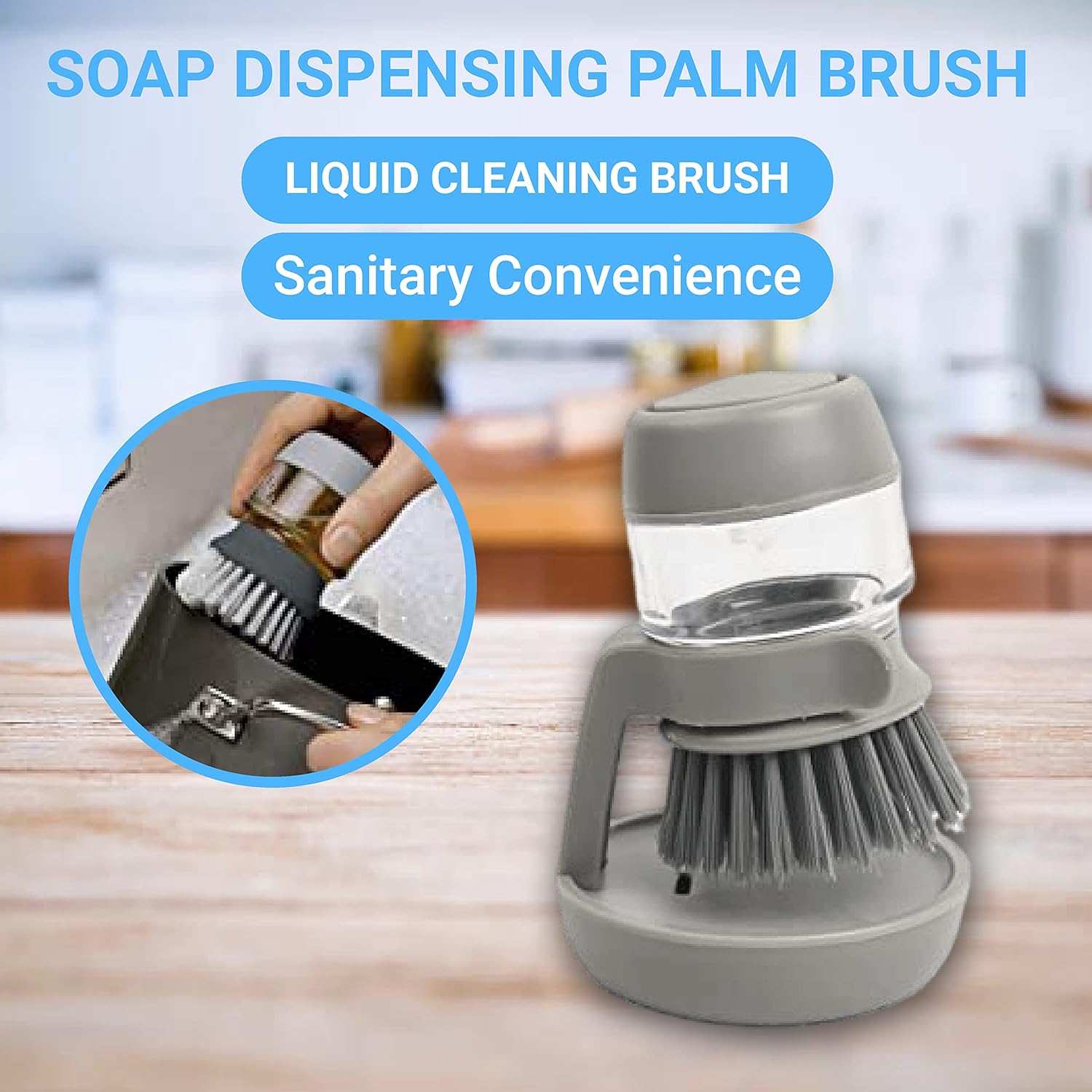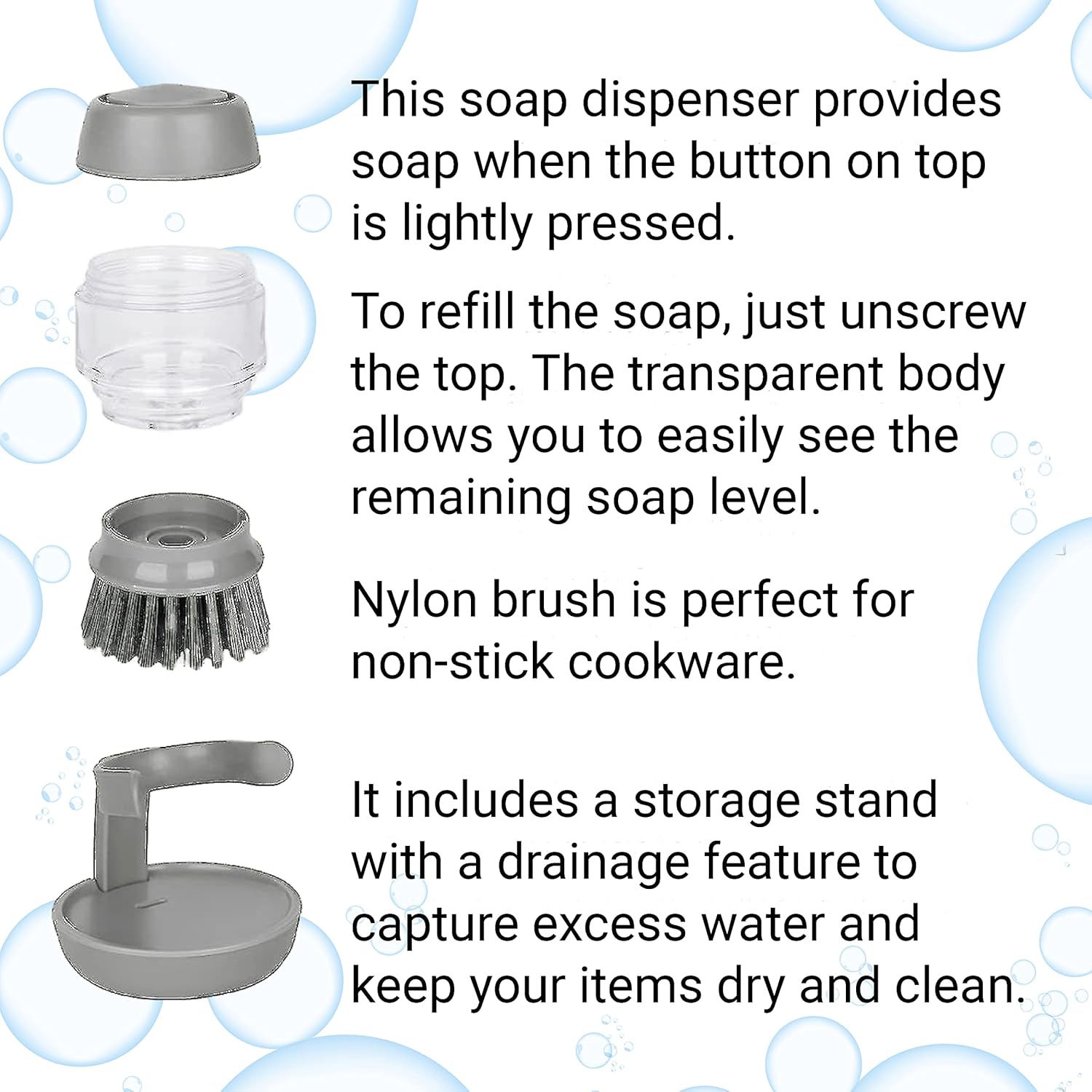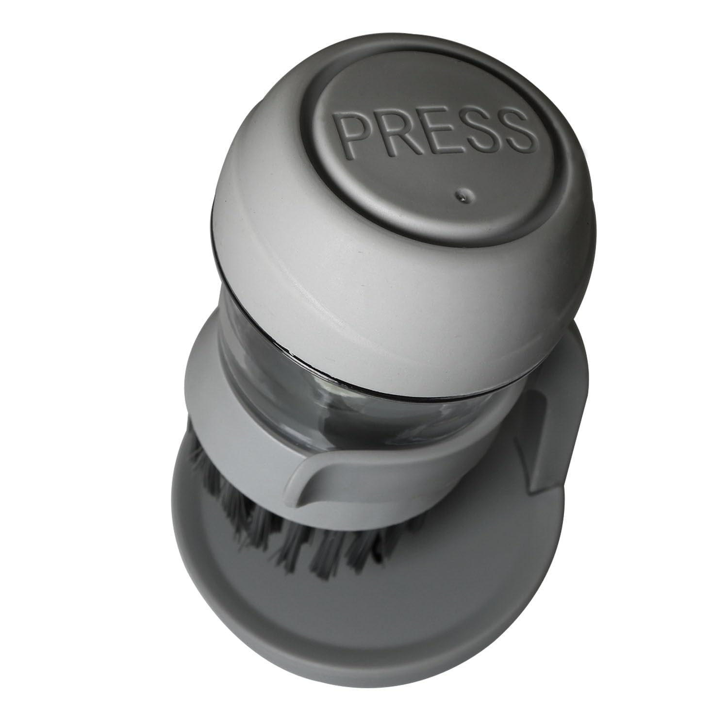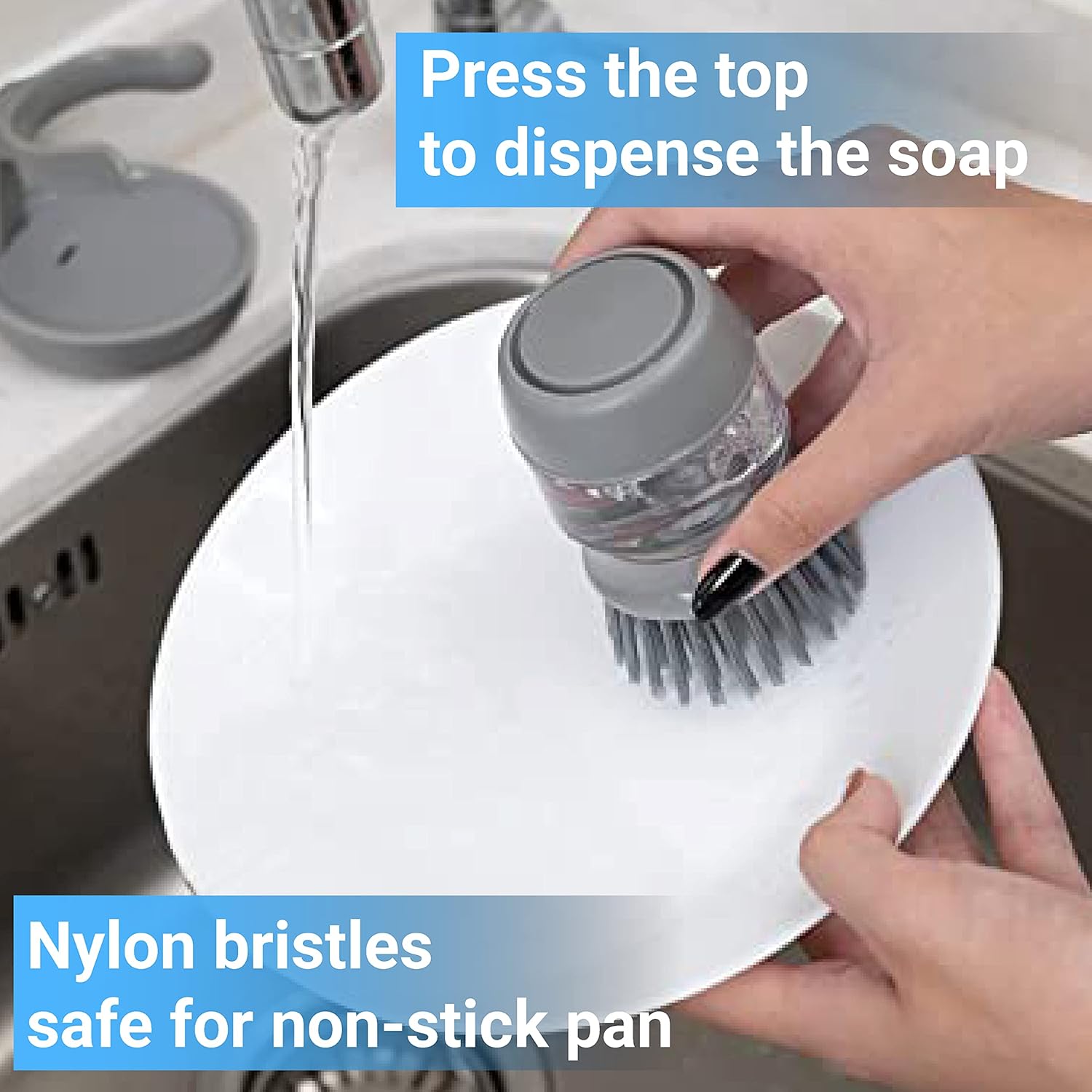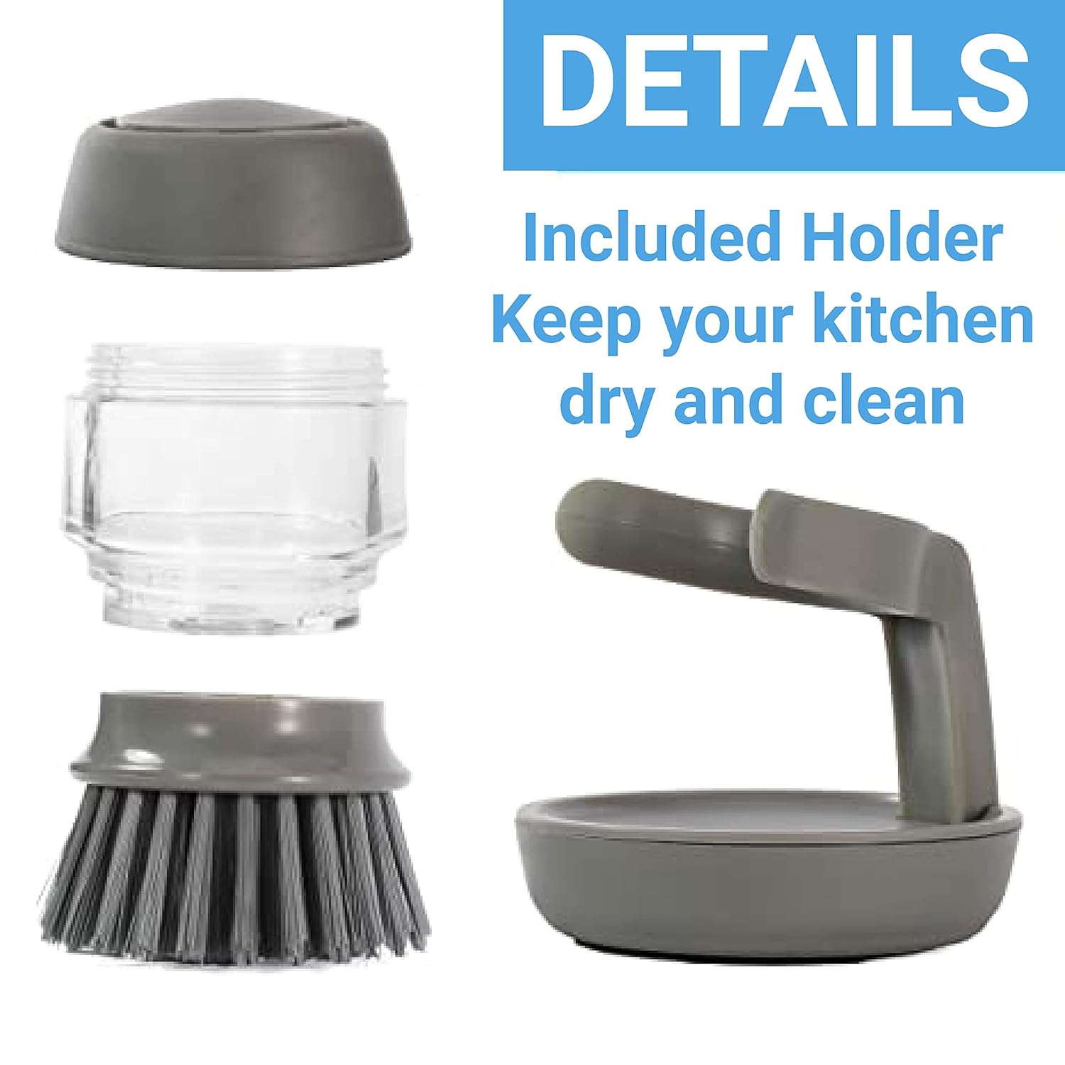 Household Kitchen Stove Utensils Cleaning Brush Grey Soap Storage Dispensing Handheld Brush Set with Stand Replaceable Brush Heads Press and Automatic Liquid Dispensing