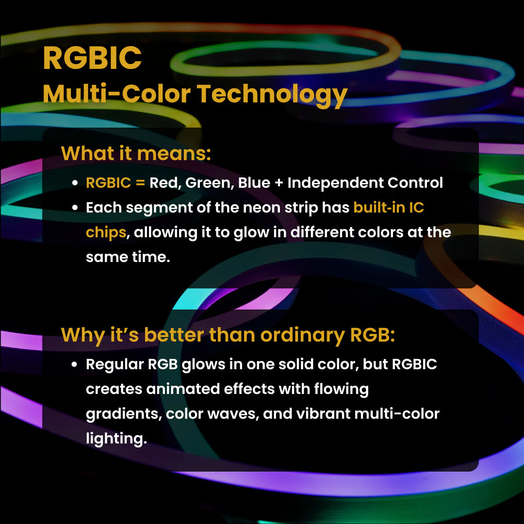 RGB shows one colour at a time. RGBIC can show multi-colour effects simultaneously (more dynamic).