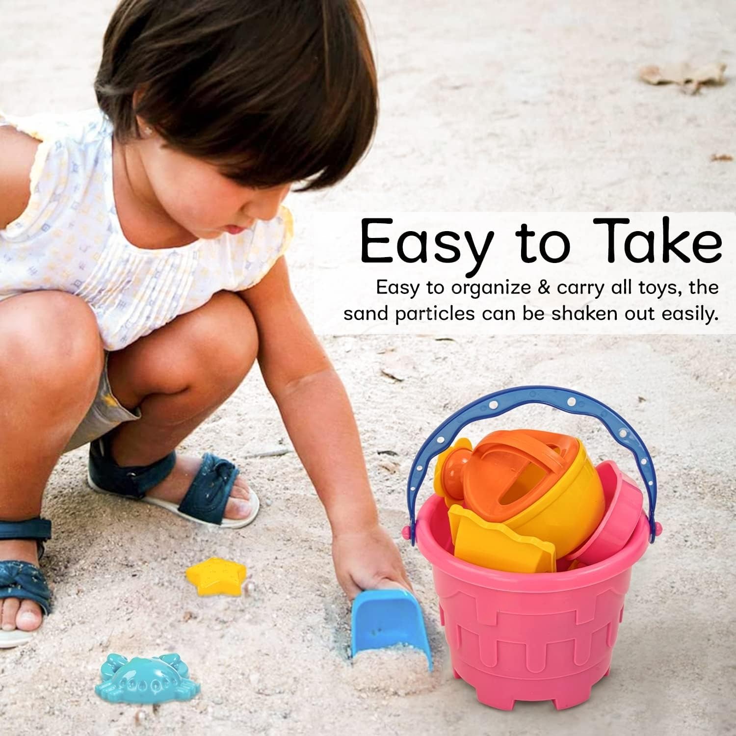 Sand Game Castle Building Plastic Beach Toy Set for Kids Summer Fun Creative Activity Playset& Gardening Tool with Accessories & Bucket